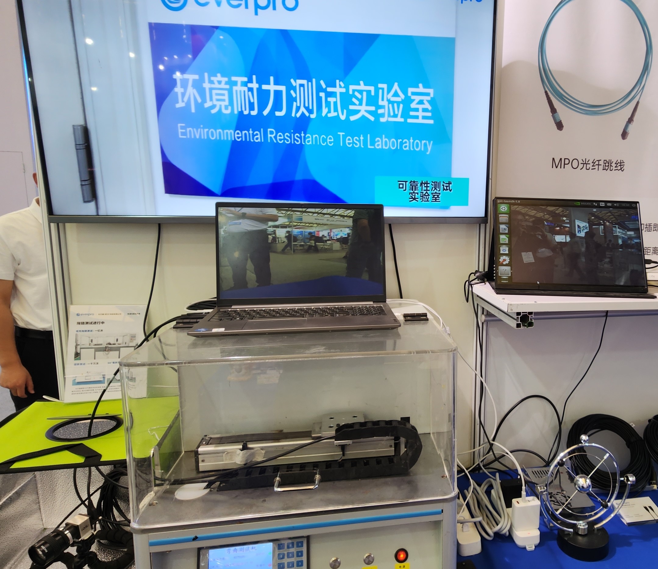 為了讓參展嘉賓近距離感受有源光纜的魅力,長芯盛將只在實(shí)驗(yàn)室出現(xiàn)的高速坦克鏈測試儀搬到展會現(xiàn)場,并用機(jī)器人混合光纖數(shù)據(jù)線連接MIPI相機(jī)與筆記本電腦,搭建出實(shí)時拍攝的應(yīng)用環(huán)境,動態(tài)展示長芯盛有源光纜優(yōu)異的性能與品質(zhì)。